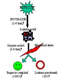 Fig. 22.1: Istoria naturală a infecţiei HPV: în urma infecţiei cu HPV apare o leziune acută, care în funcţie de intervenţia răspunsului imun al gazdei poate regresa sau poate da o leziune persistentă.