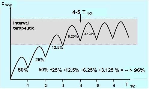 Aşa cum reiese din ecuaţie, T1/2 este o constantă şi nu depinde de concentraţia medicamentului. Daca T1/2 este cunoscut se poate calcula modul de împărţire a dozelor şi intervalul de timp la care trebuie administrate pentru a se atinge nivelul terapeutic.